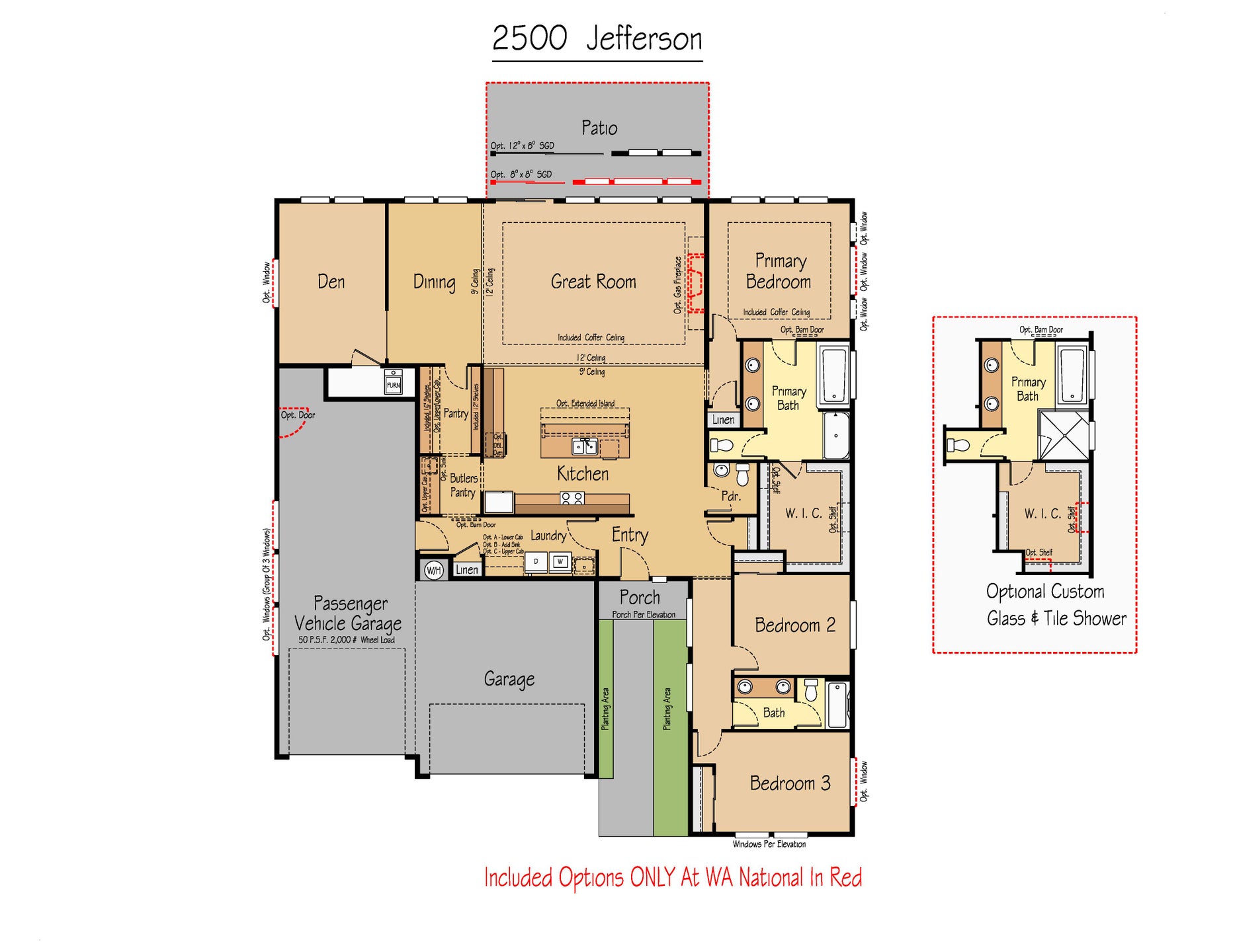 With optional customizations like coffered ceilings, a custom mud-set shower, or a closet at the den, the Jefferson offers unparalleled flexibility, allowing homeowners to tailor their space to suit their unique needs. This home represents the perfect balance of modern elegance, functionality, and comfort, making it a standout choice for those seeking a home designed to complement their lifestyle.