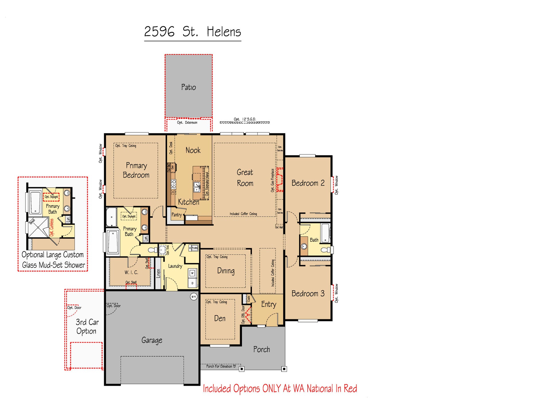 The St. Helens has a great flow to the home’s layout, offering privacy for the bedrooms and a real feeling of openness in the central living area. As with all Garrette Homes designs, there are a variety of options available that add convenience, space, and style to the home. Among some of the options available for the St. Helens home design are: